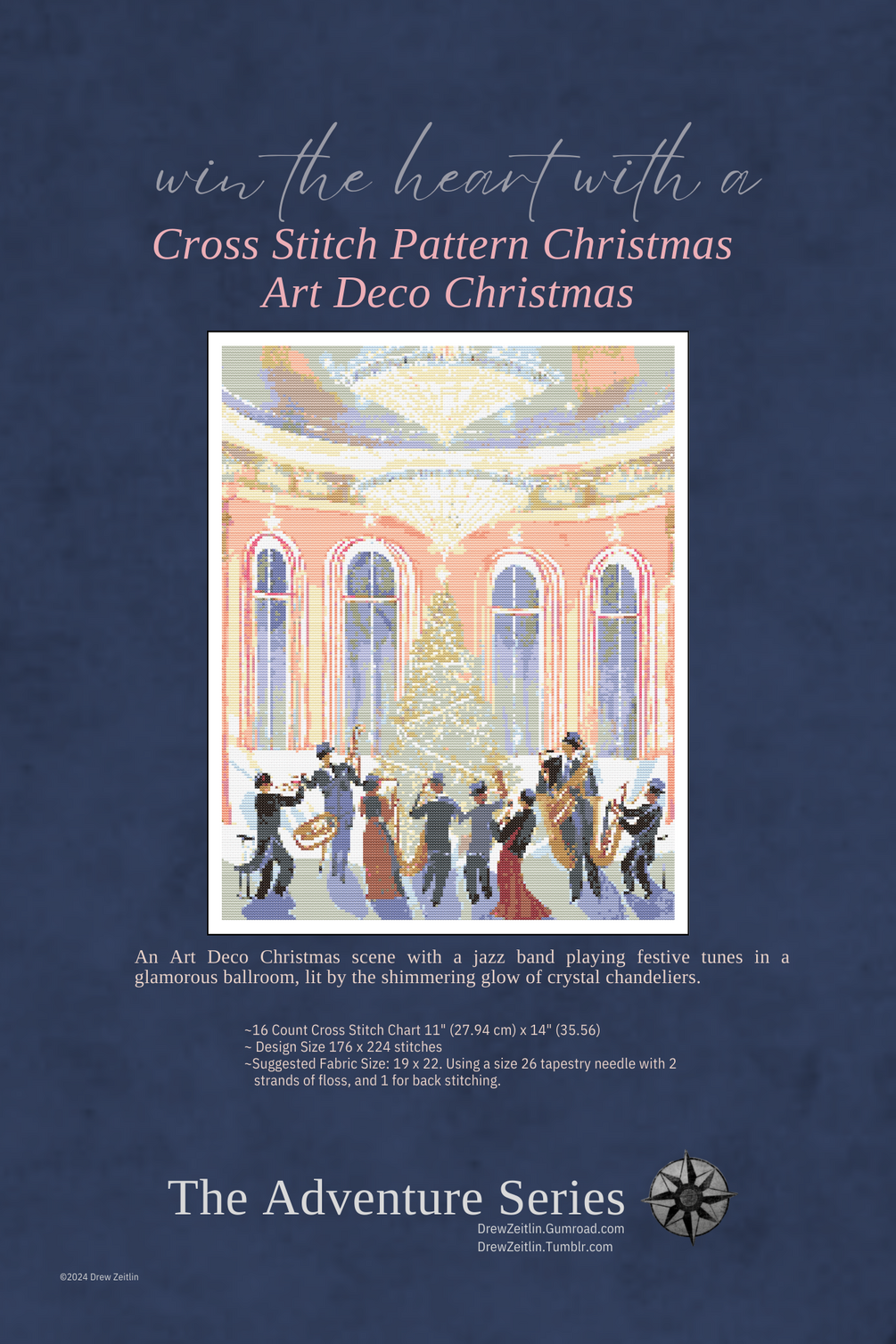 Introducing our cross-stitch pattern featuring an Art Deco Christmas scene with a jazz band playing festive tunes in a glamorous ballroom, lit by the shimmering glow of crystal chandeliers. This pattern, designed on a 16 Count Cross Stitch Chart measuring 11" x 14" (27.96 cm x 35.56 cm) and featuring a design size of 176 x 224 stitches, captures the elegance and sophistication of the Art Deco era during the holiday season. An Art Deco Christmas is characterized by its stylish geometric designs, luxurious ambiance, and a nostalgic charm that transports you to the golden age of jazz and celebration.